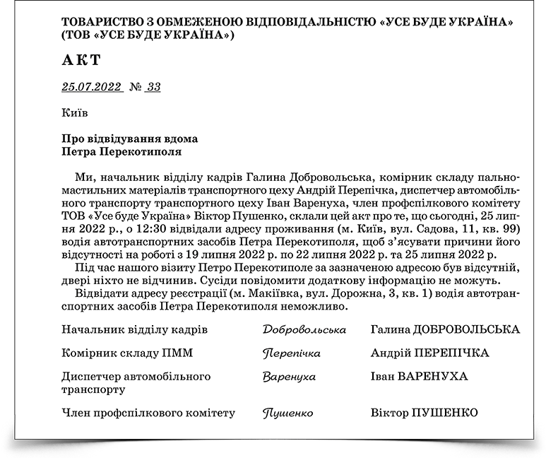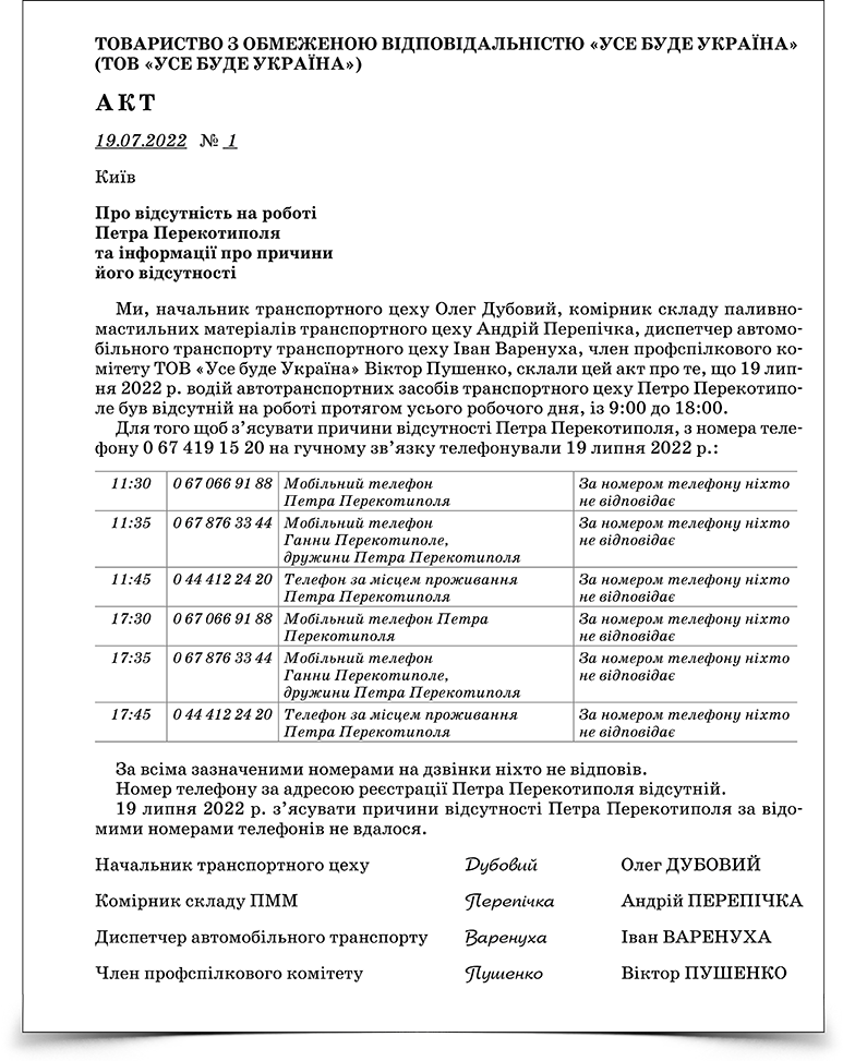Особа, якій доручили розслідування, складає акти про відсутність працівника на роботі (див. Додаток 2). Такі акти доцільно складати за кожен день відсутності працівника на роботі, поки триває розслідування. Якщо це неможливо — у перший тиждень складайте акти за кожен день/зміну відсутності. Надалі — щотижнево або щомісячно. Не припиняйте документально фіксувати відсутність працівника. Телефонуйте працівникові при свідках і фіксуйте результати в акті, оскільки саме відсутність інформації про причину відсутності на роботі є однією з умов звільнення за цією підставою.