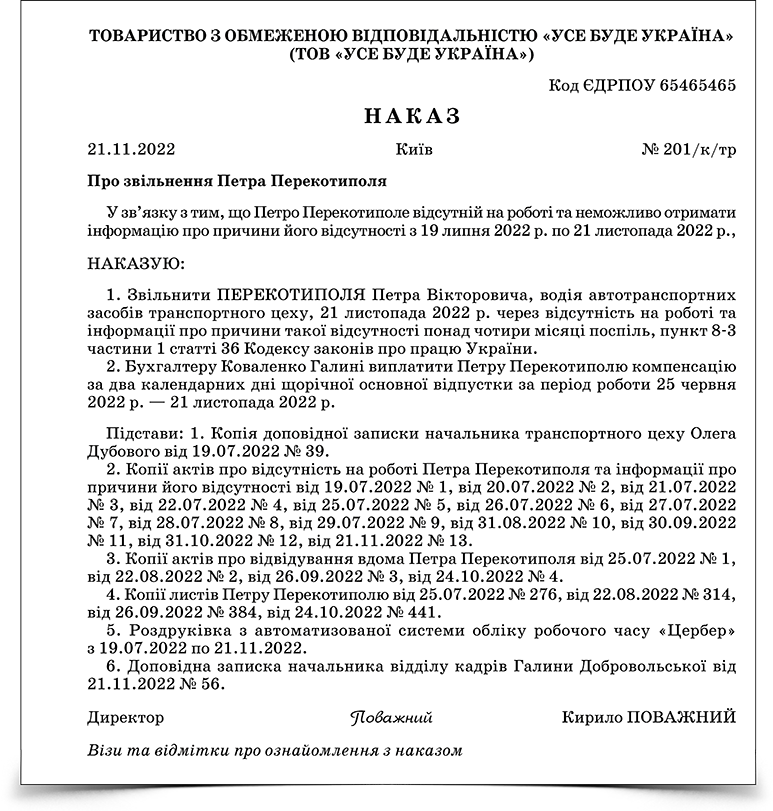 - Наказ про звільнення працівника через тривалу відсутність на роботі 26.73 КБ