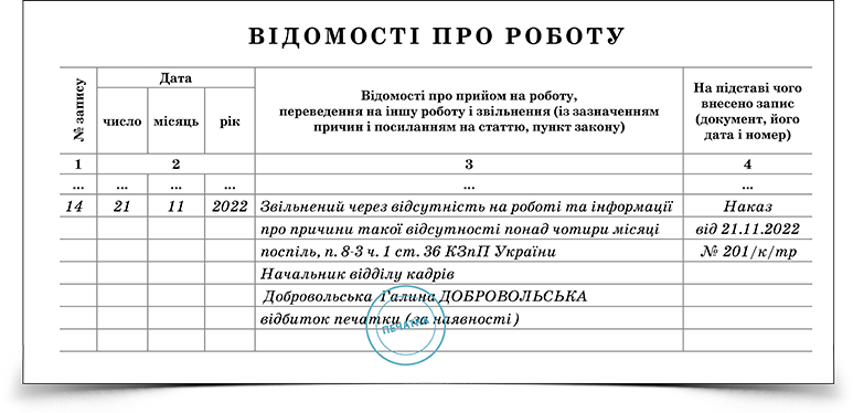 - Запис у трудовій книжці про звільнення працівника через тривалу відсутність на роботі 27.15 КБ