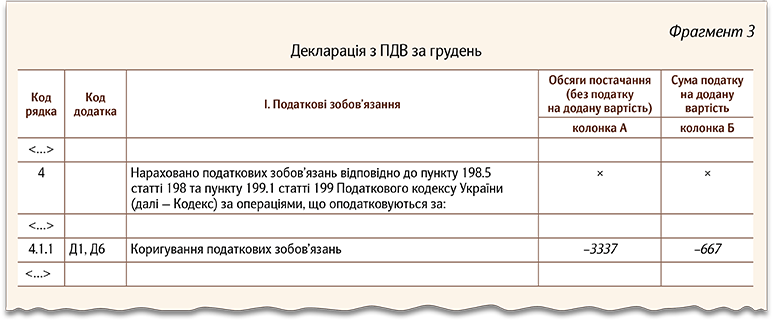 Підсумкові дані таблиці 2 додатка Д6 із граф 6 і 9 зі знаком «–» переносимо до рядка 4.1.1 декларації з ПДВ за грудень (див. Фрагмент 3).
