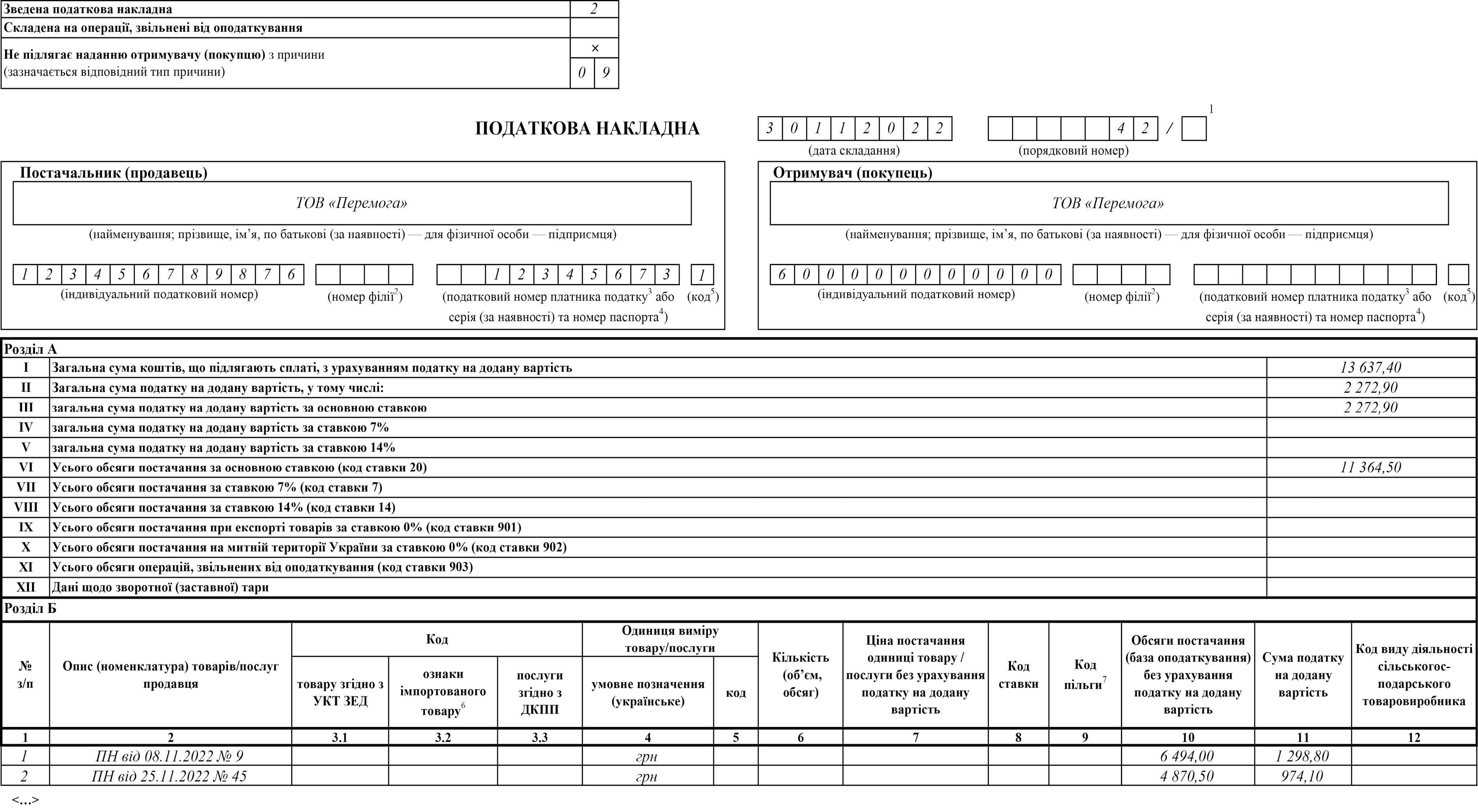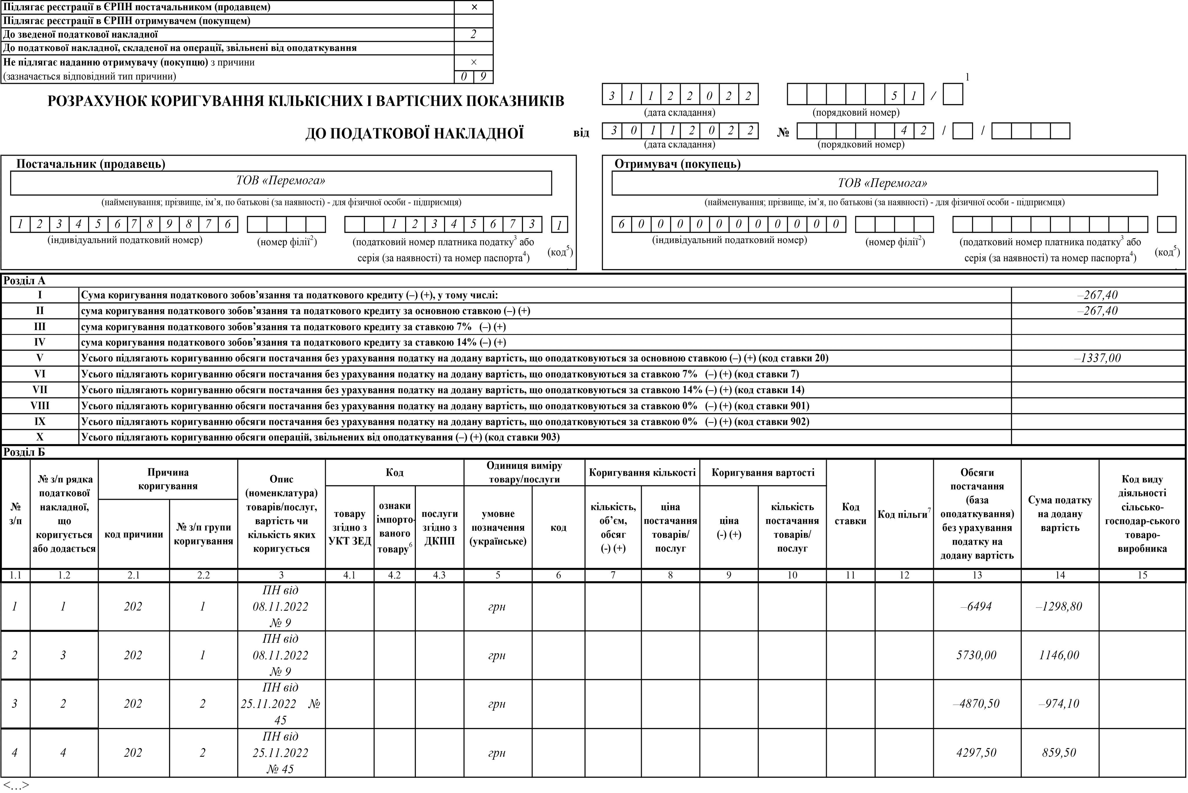 Зразок заповнення розрахунку коригування до зведеної податкової накладної за листопад 2022 року
