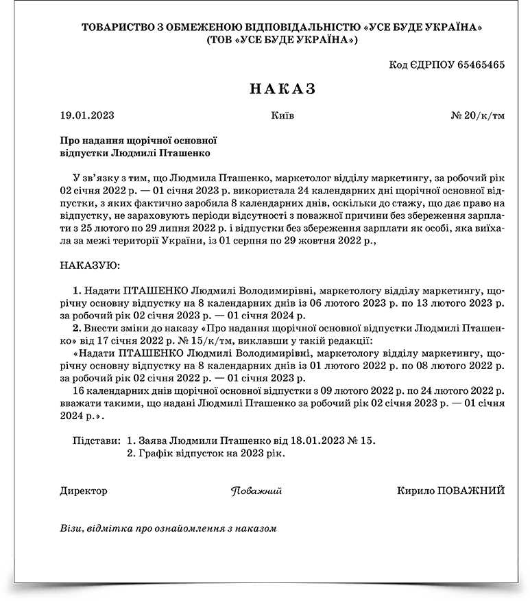 Зразок наказу про щорічну основну відпустку працівнику, який за попередній робочий рік використав більше днів, ніж заробив