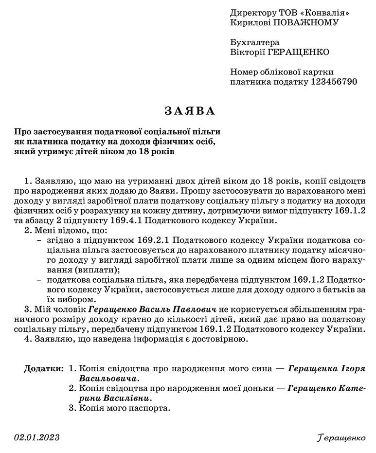 Бухгалтер має отримати заяву на отримання ПСП (див. Додаток 3) та копії документів — свідоцтв про народження дітей, свідоцтва про шлюб, рішення суду про розлучення і паспортів.